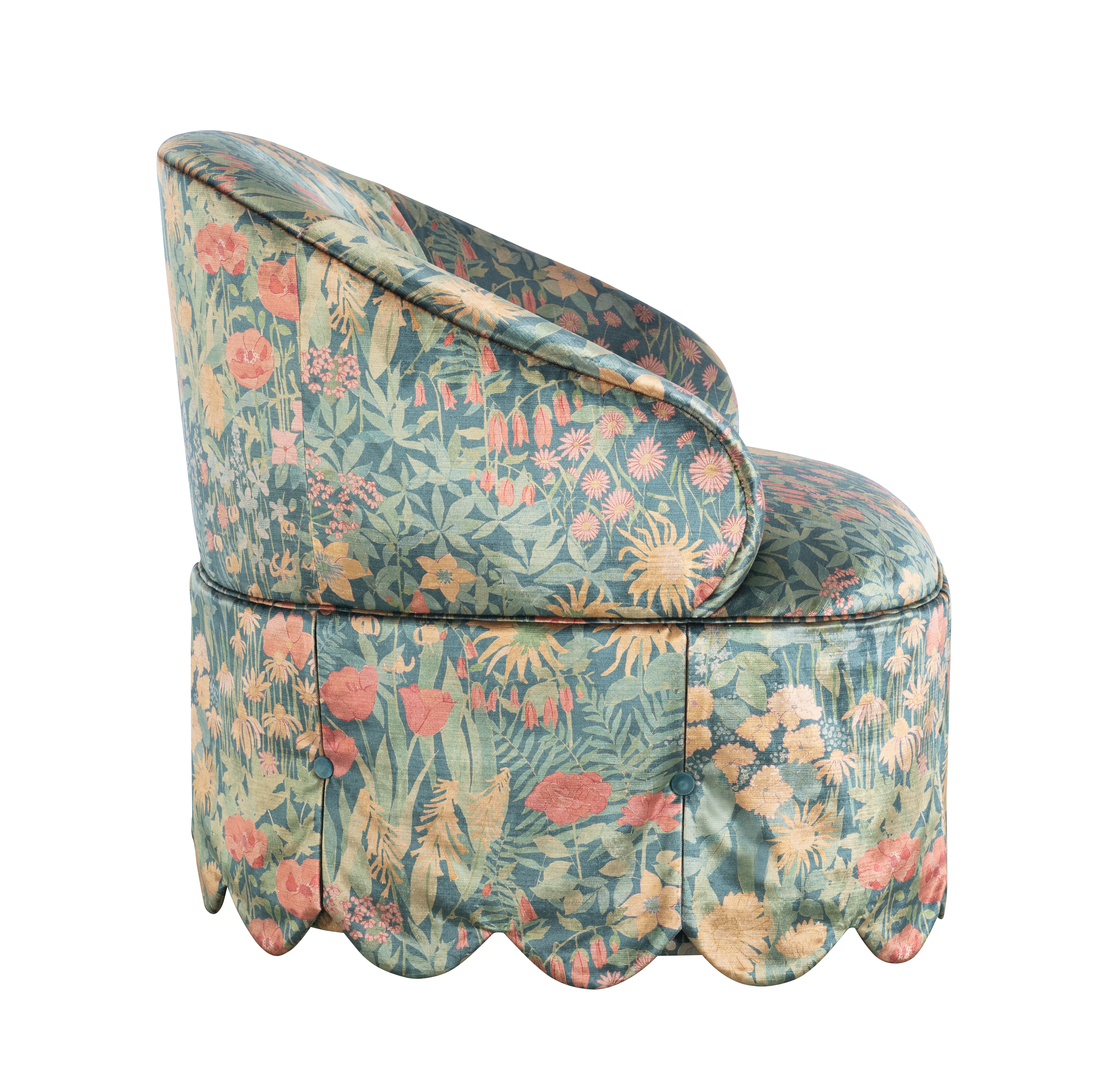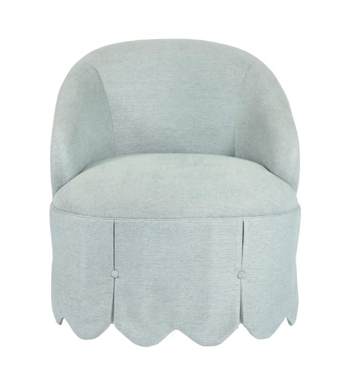 The Queen Dorothy Scallop Chair pays tribute to “Queen Dorothy,” a visionary furniture entrepreneur who built a thriving furniture business, starting in 1947 to present day. She pioneered the “Street of Dreams” concept, featuring 26 galleries and lifestyle spaces across 100,000 sq. ft., while championing American-made products. Fit for royalty, this chair offers a luxurious sit with gently sloping arms and an elegant scalloped skirt base, blending regal charm with timeless comfort. Standard with scallop skirt and button. No trims are available on the scallop skirt.