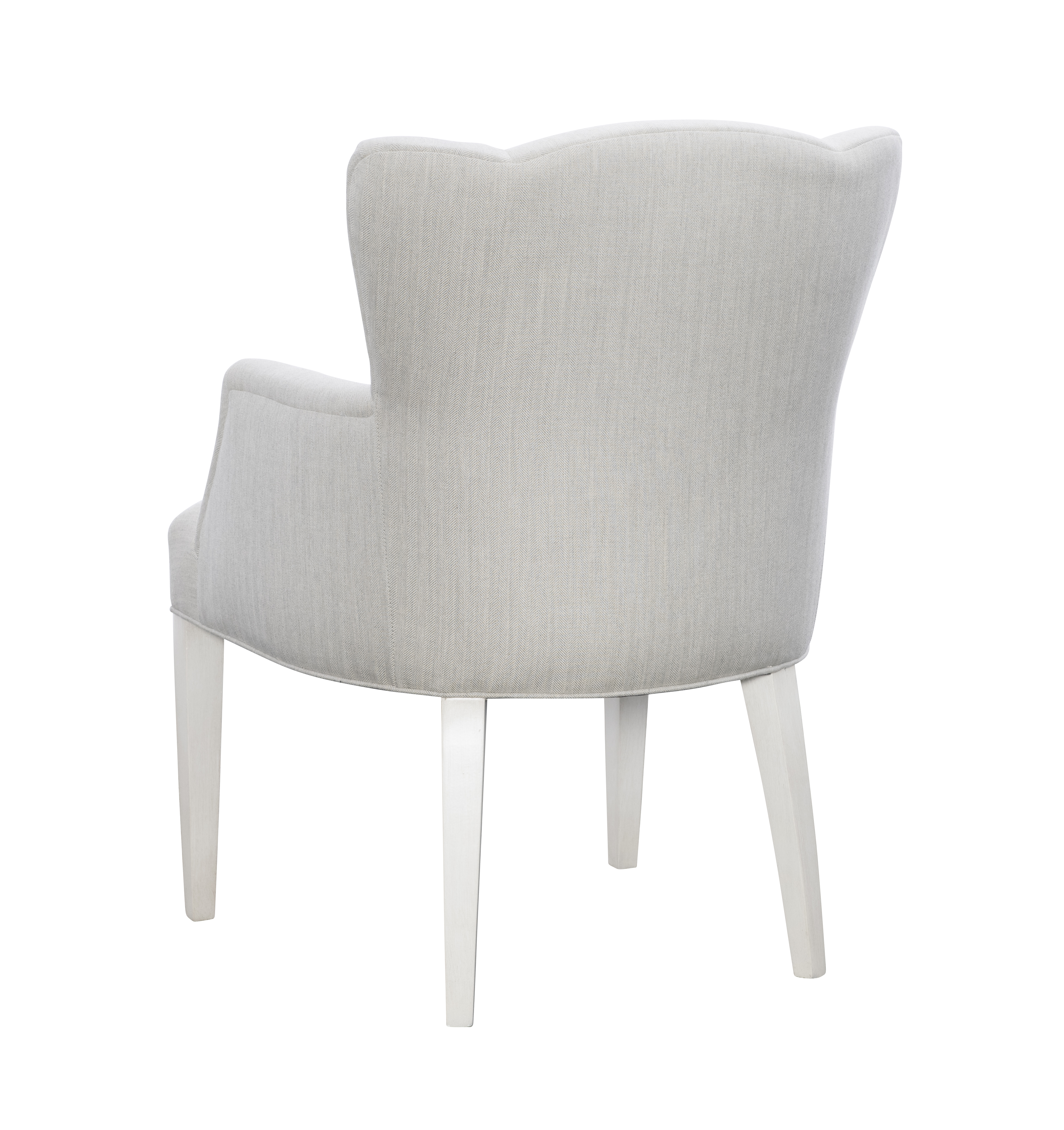 A graceful petite dining arm chair with an elegant, understated presence. The maple legs taper gently to the floor, giving it a light and tailored stance. The back is crowned with a sweetheart, undulating top profile that softens the silhouette. Slim arms extend forward in a refined line, then swoop delicately at the front for a subtle gesture of comfort. Scaled for smaller spaces, this chair offers a charming and versatile solution for a dining arm chair without sacrificing style or sophistication.