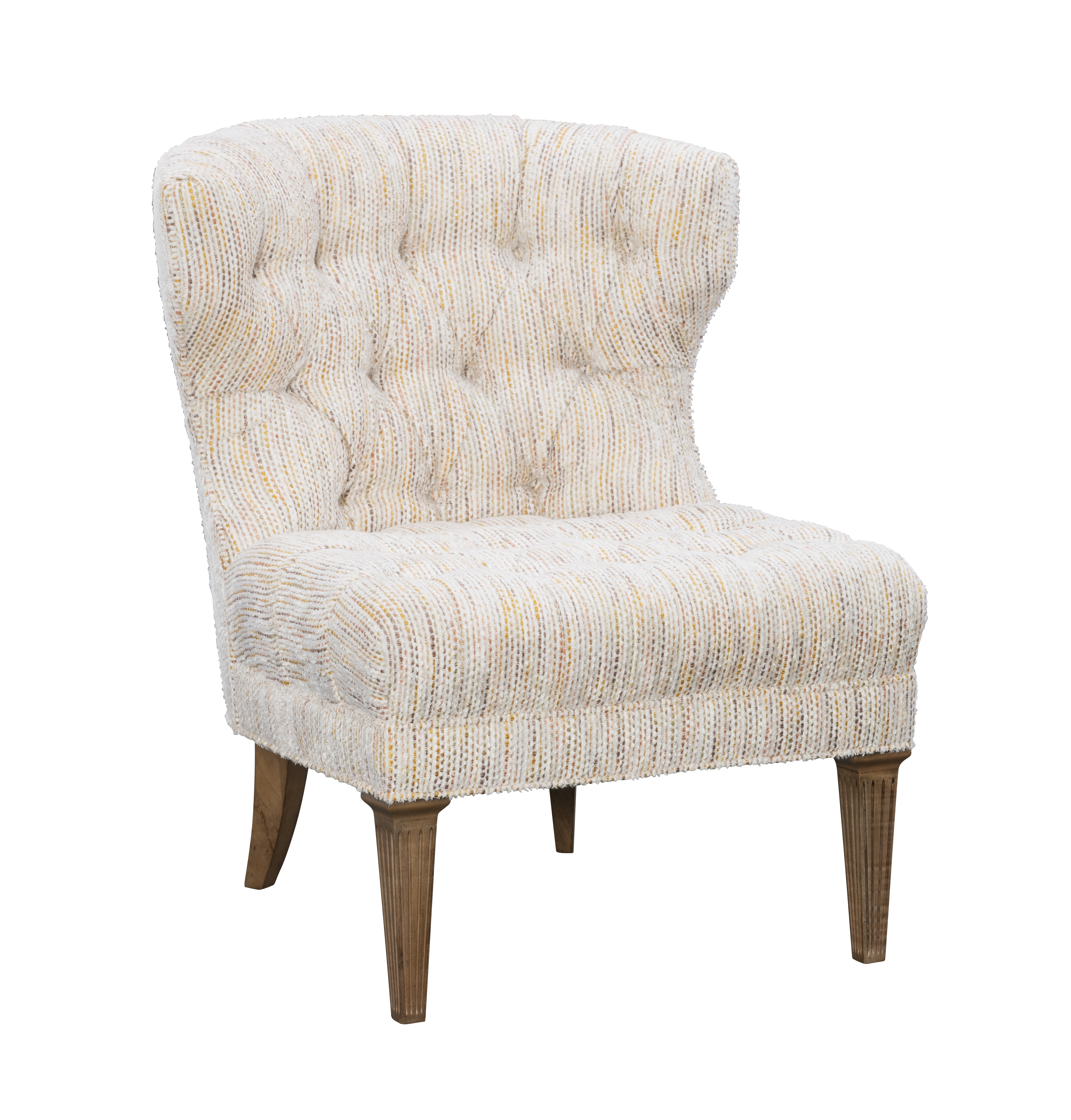 The Kenley Tufted Chair is a graceful petite rendition of the timeless wing chair. Its gently curving back sweeps around the shoulders, with wings that extend just enough to embrace. The deep tufting, finished with hand-pulled buttons, lends an air of refinement, while delicately fluted legs complete the chair with a touch of elegance from every angle.