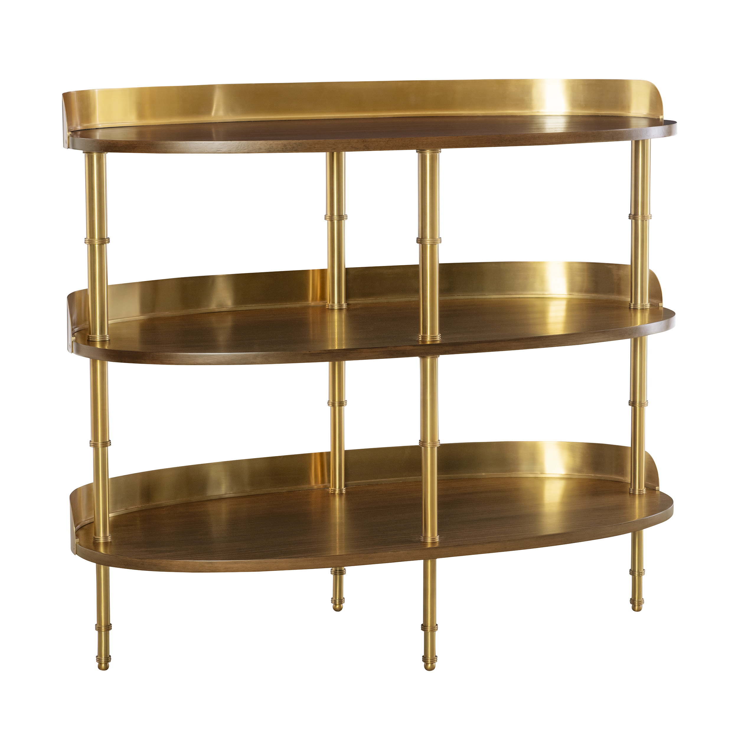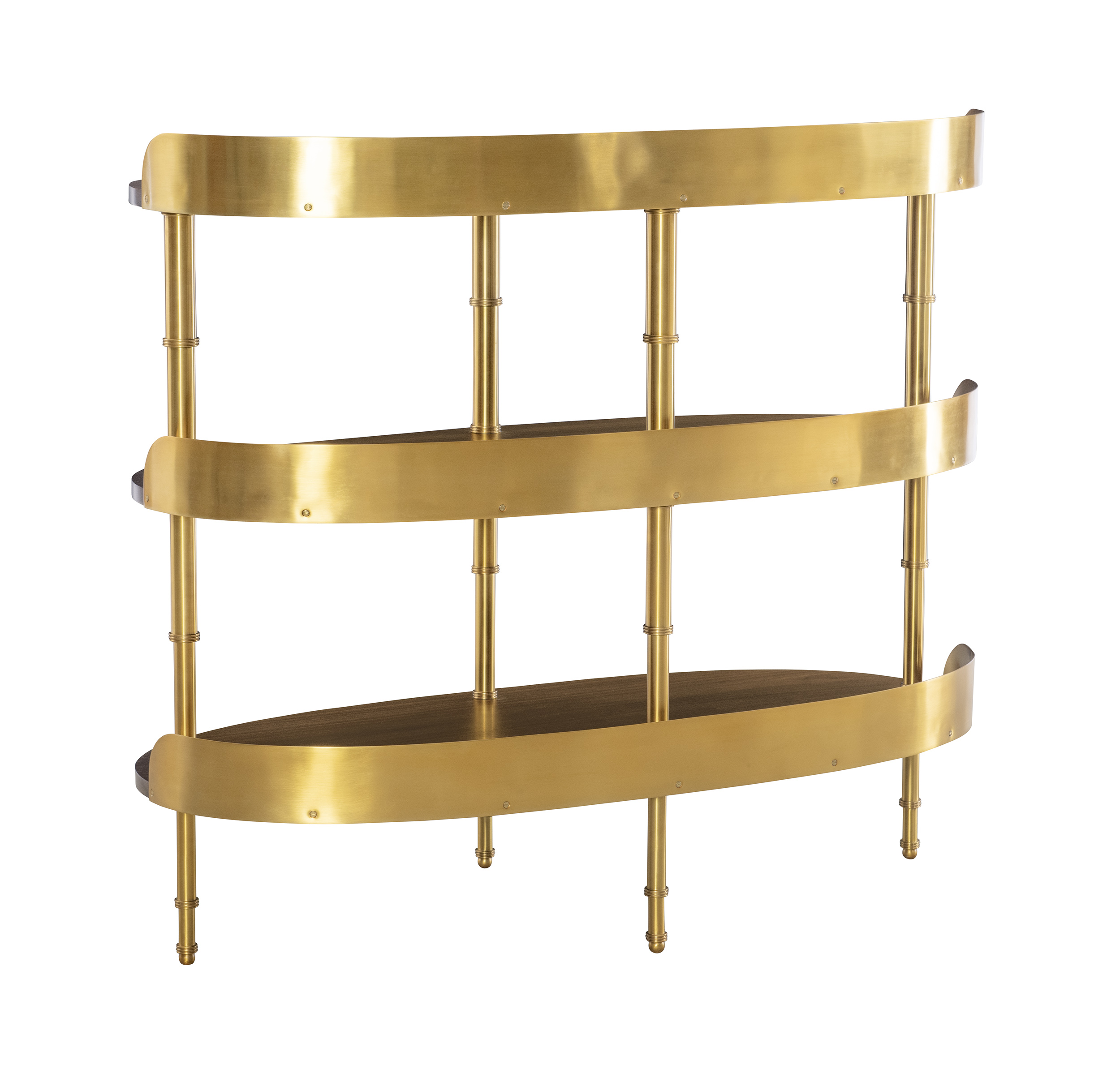 A striking balance of refinement and texture, this bar pays homage to Mariette Himes Gomez’s original design. The frame is elevated with a brass gallery and distinctive brass bamboo uprights, lending a touch of jewelry-like detail and architectural rhythm. Warm walnut shelves, finished in a rich truffle stain, provide both function and depth, offering a luxurious stage for display and storage. Elegant and timeless, this piece embodies Gomez’s legacy of sophisticated restraint and modern classicism.