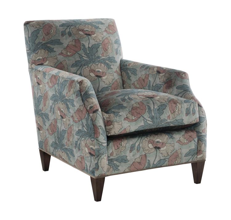 The Lorens Chair features slender notched front arms that terminate in elegantly tapered posts. Lorens is weltless except for a single welt around the base of the frame. A companion ottoman and sofa are also available.