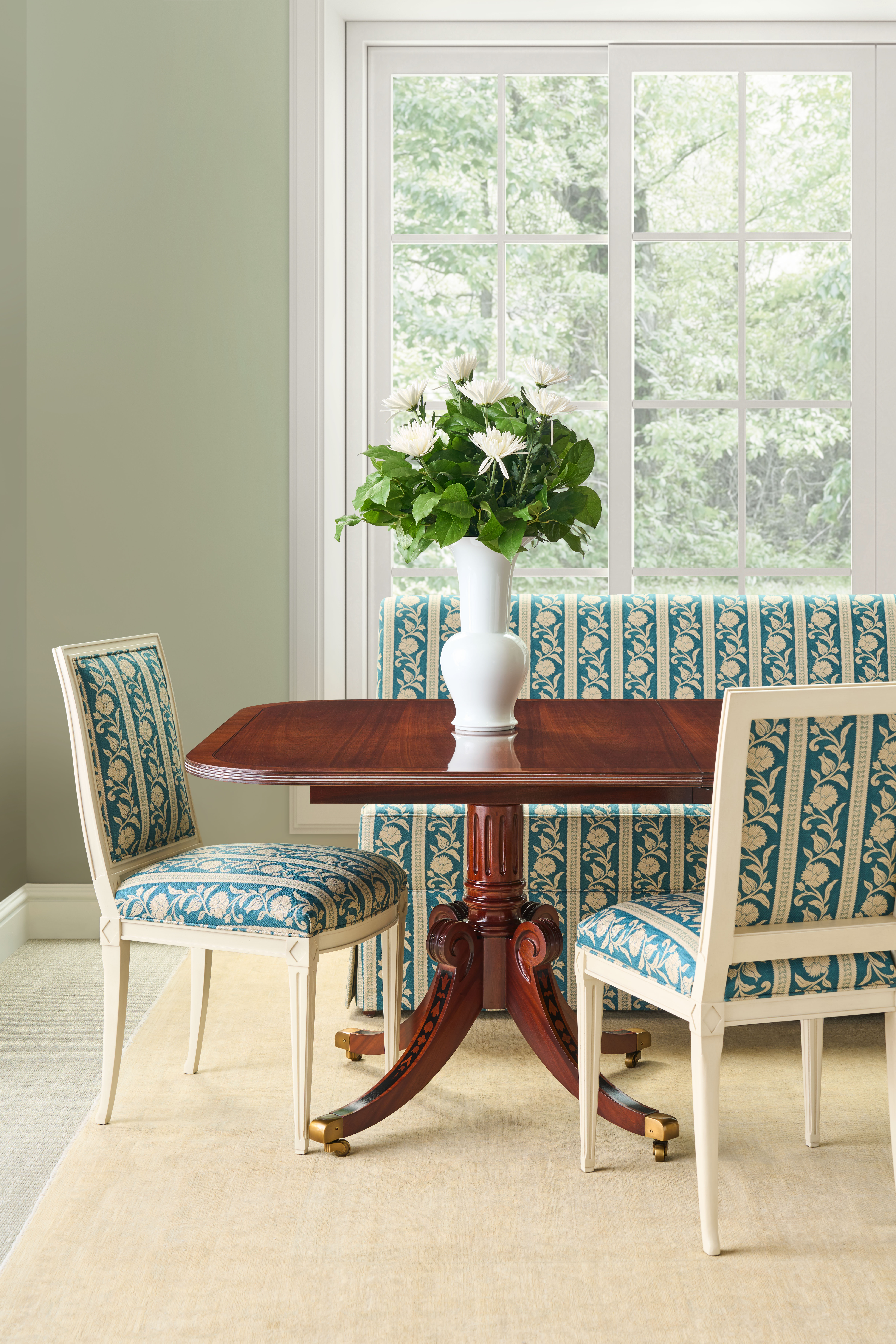 The Newport Dining Table is available in three sizes resulting in the potential to extend from 96" to 216". The Newport Pedestals feature hand applied ebonized inlay with bell flowers topped by hand carved scrolls and a fluted column and are sold individually or as a pair. Standard in Antique Brass ferrules with casters, optional Satin Nickel ferrules with casters are available upon request. The Newport base and tops are included in the Personal Preference Dining Table program which enables hundreds of dining table combinations.