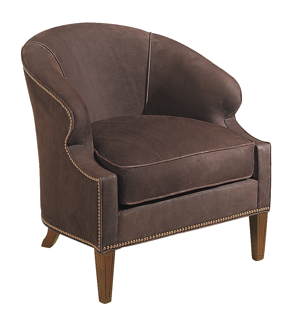 Circular styling characterizes the Edward chair. Burnished brass hobnailed and sloping shaped arms add dimension and character. The exposed wood legs create custom options. Standard with NS-00 nail trim. Spring-Down seat cushion standard. Cream Lacquer paint and NS-03 nail head trim shown.
