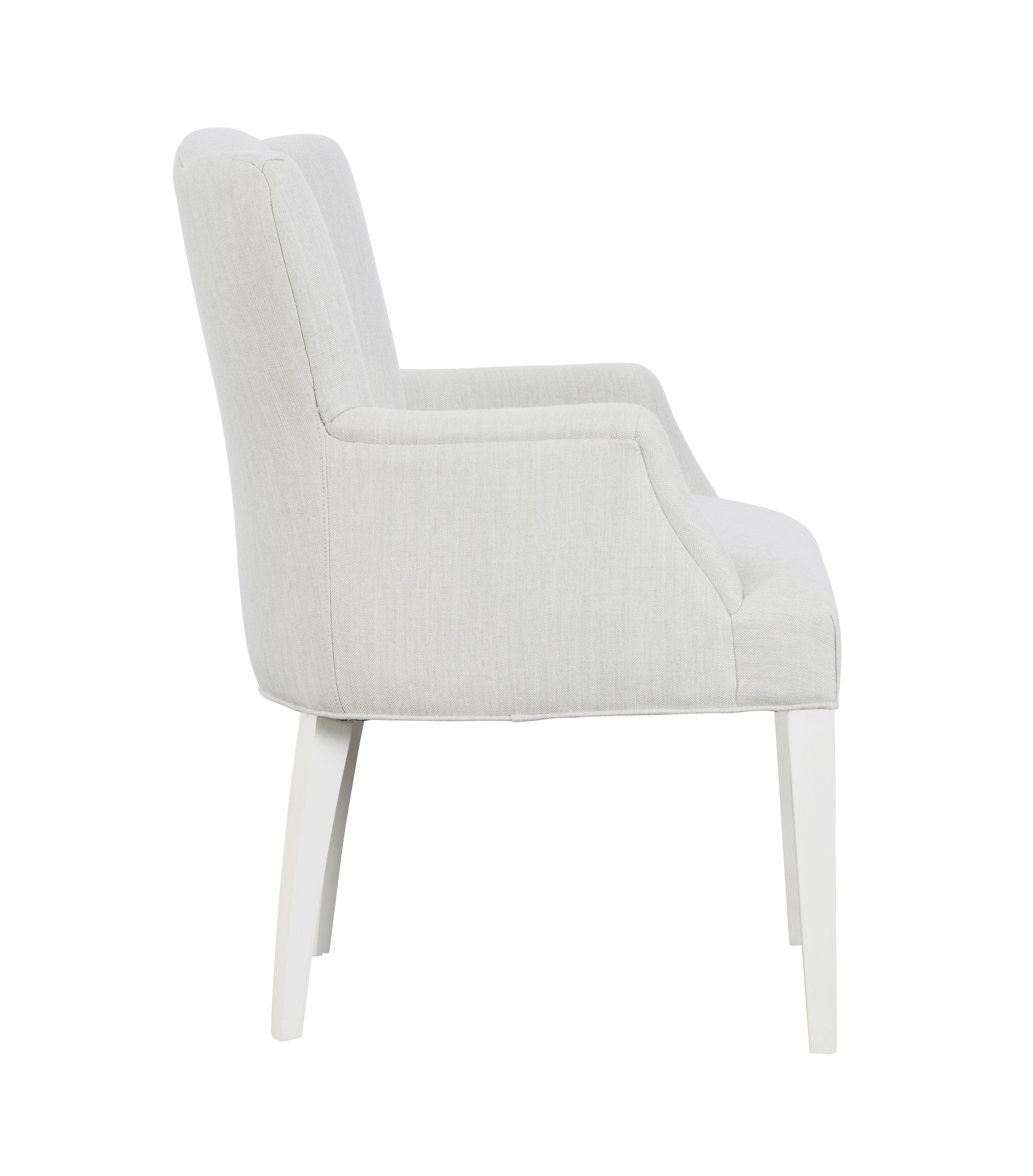 A graceful petite dining arm chair with an elegant, understated presence. The maple legs taper gently to the floor, giving it a light and tailored stance. The back is crowned with a sweetheart, undulating top profile that softens the silhouette. Slim arms extend forward in a refined line, then swoop delicately at the front for a subtle gesture of comfort. Scaled for smaller spaces, this chair offers a charming and versatile solution for a dining arm chair without sacrificing style or sophistication.