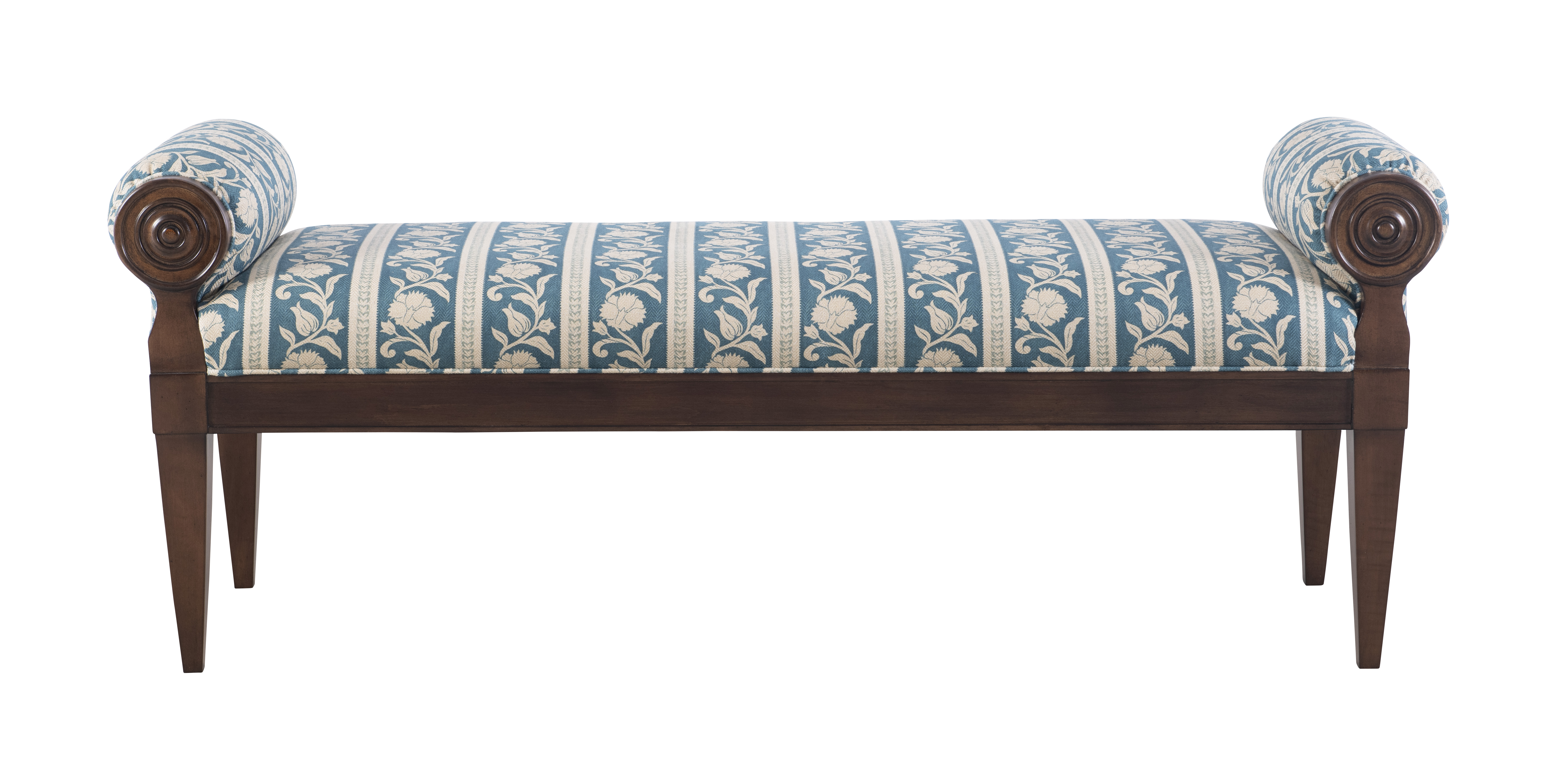 The Mia M2M® bench ranges from 28” W to 72”. It is accented with two end bolsters with a concentric circle carved detail and bead molding. The rails are accented with top and bottom bead molding, a great opportunity to customize with striping. Mia will look great bunched as two small benches at the end of a bed or underneath a console or have two extended Mia benches flank the entry way of a home.