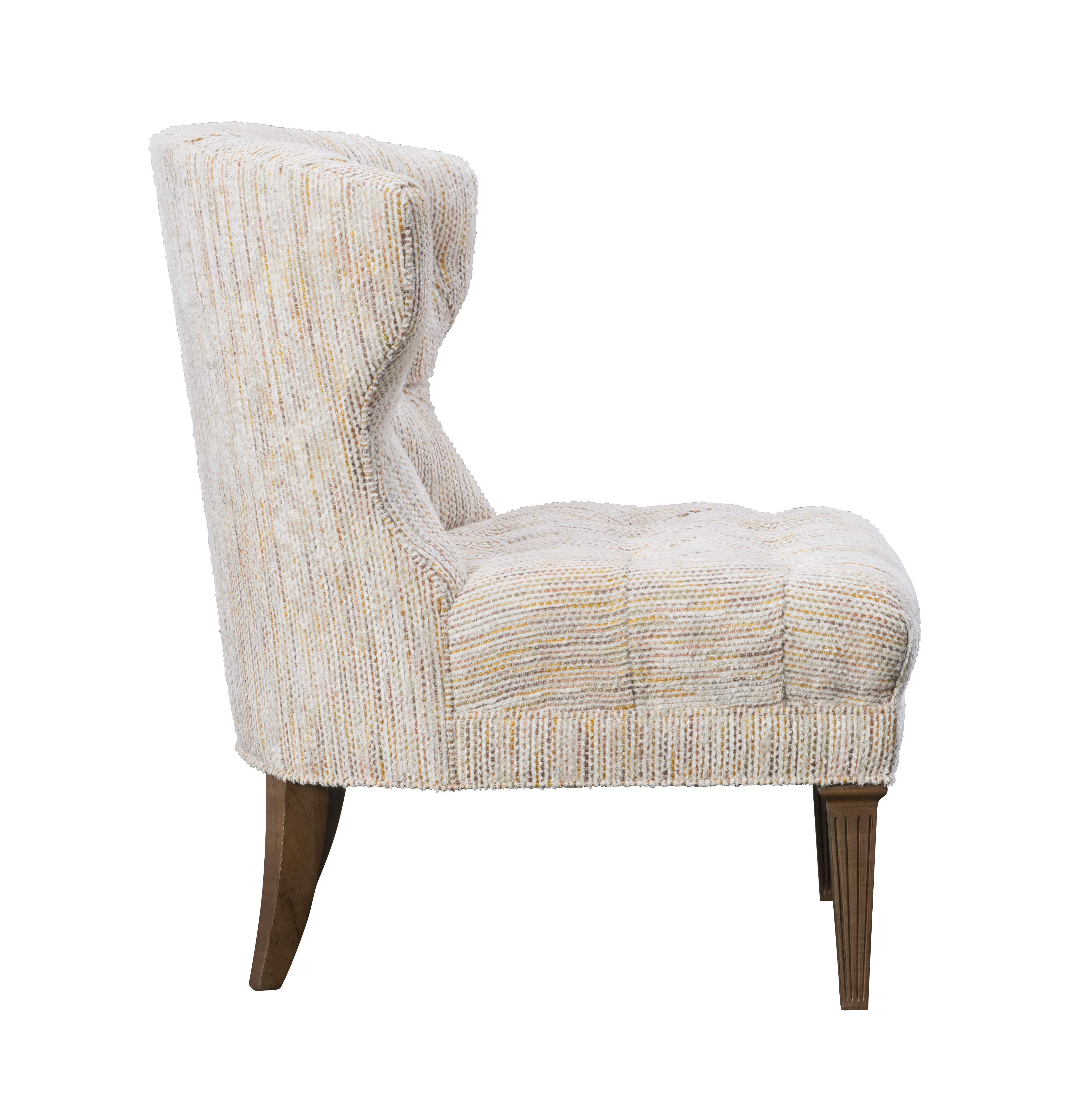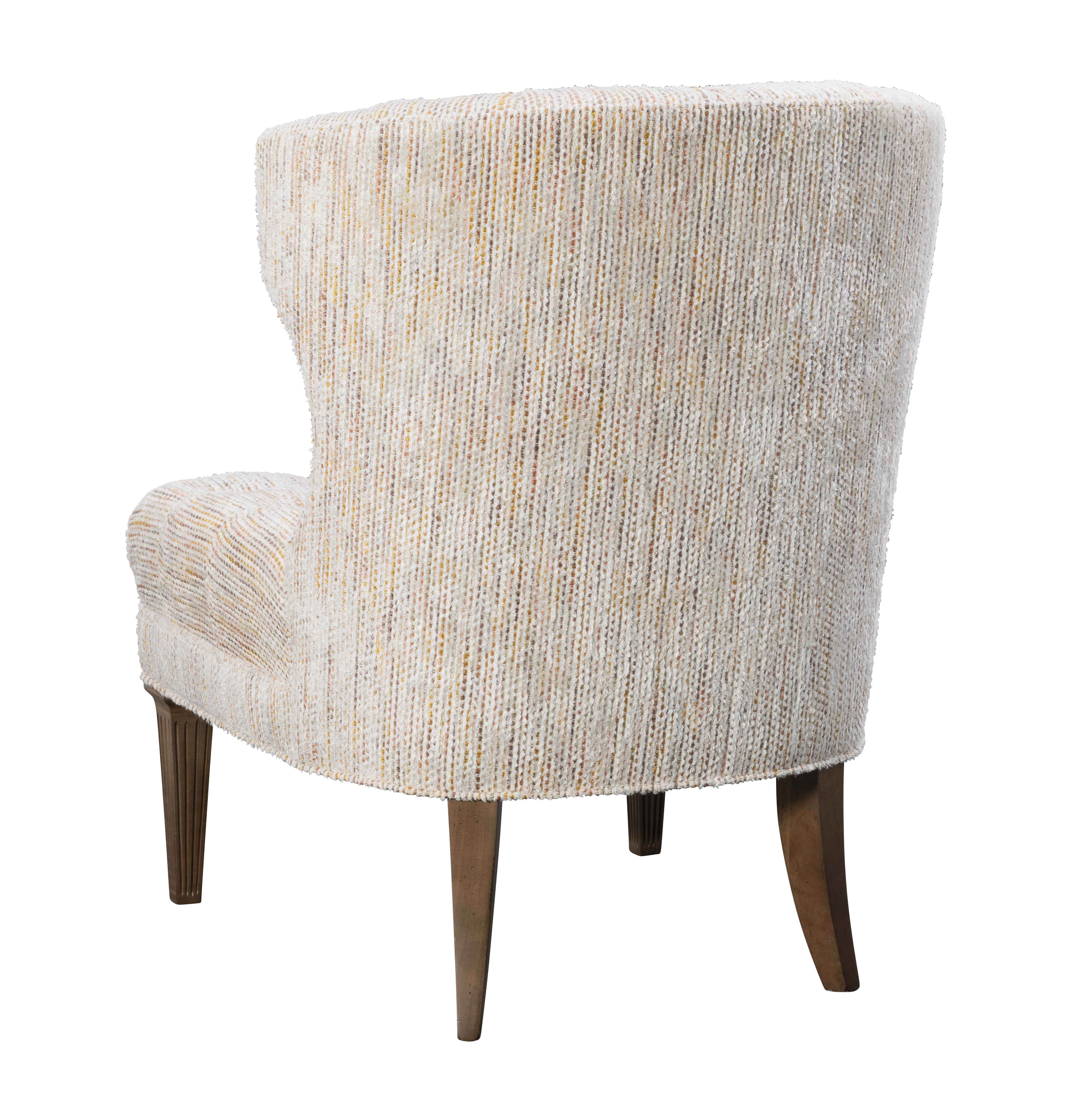 The Kenley Tufted Chair is a graceful petite rendition of the timeless wing chair. Its gently curving back sweeps around the shoulders, with wings that extend just enough to embrace. The deep tufting, finished with hand-pulled buttons, lends an air of refinement, while delicately fluted legs complete the chair with a touch of elegance from every angle.