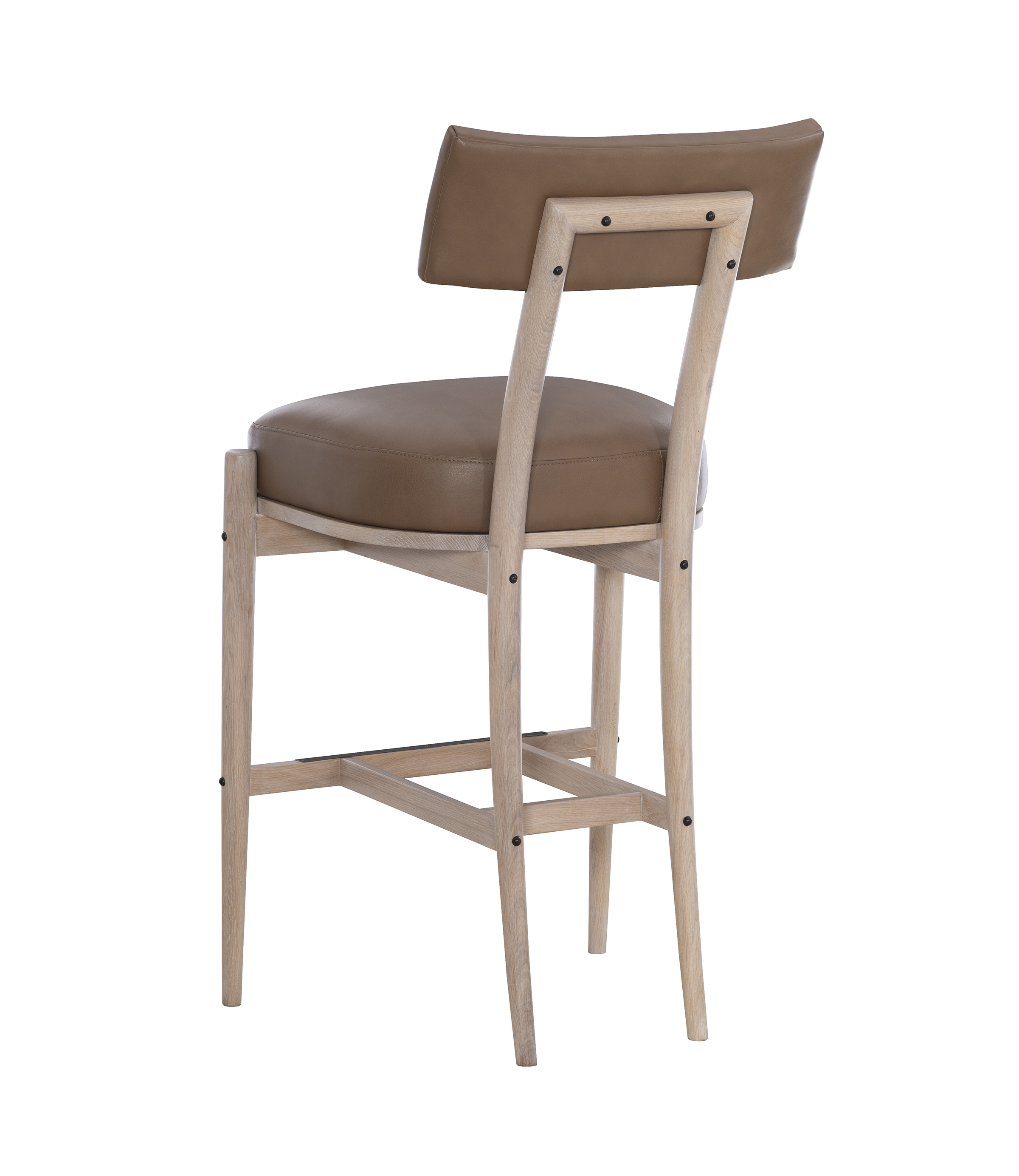 Klio is the epitome of elegance and comfort, designed for both refined dining and relaxed gatherings. With its klismos shaped back and tailored upholstery, the Klio Bar Stool invites guests to linger, offering exceptional comfort with a sculpted silhouette. The Bar Stool version maintains the same exquisite craftsmanship, elevated to the perfect height for casual dining or entertaining. Thoughtfully proportioned and meticulously constructed in solid White Oak with a choice of either Browned Steel foot guard and accents or Antique Brass foot guard and accents, Klio blends seamlessly into a range of interiors, from contemporary to transitional, making it a timeless investment in both form and function.