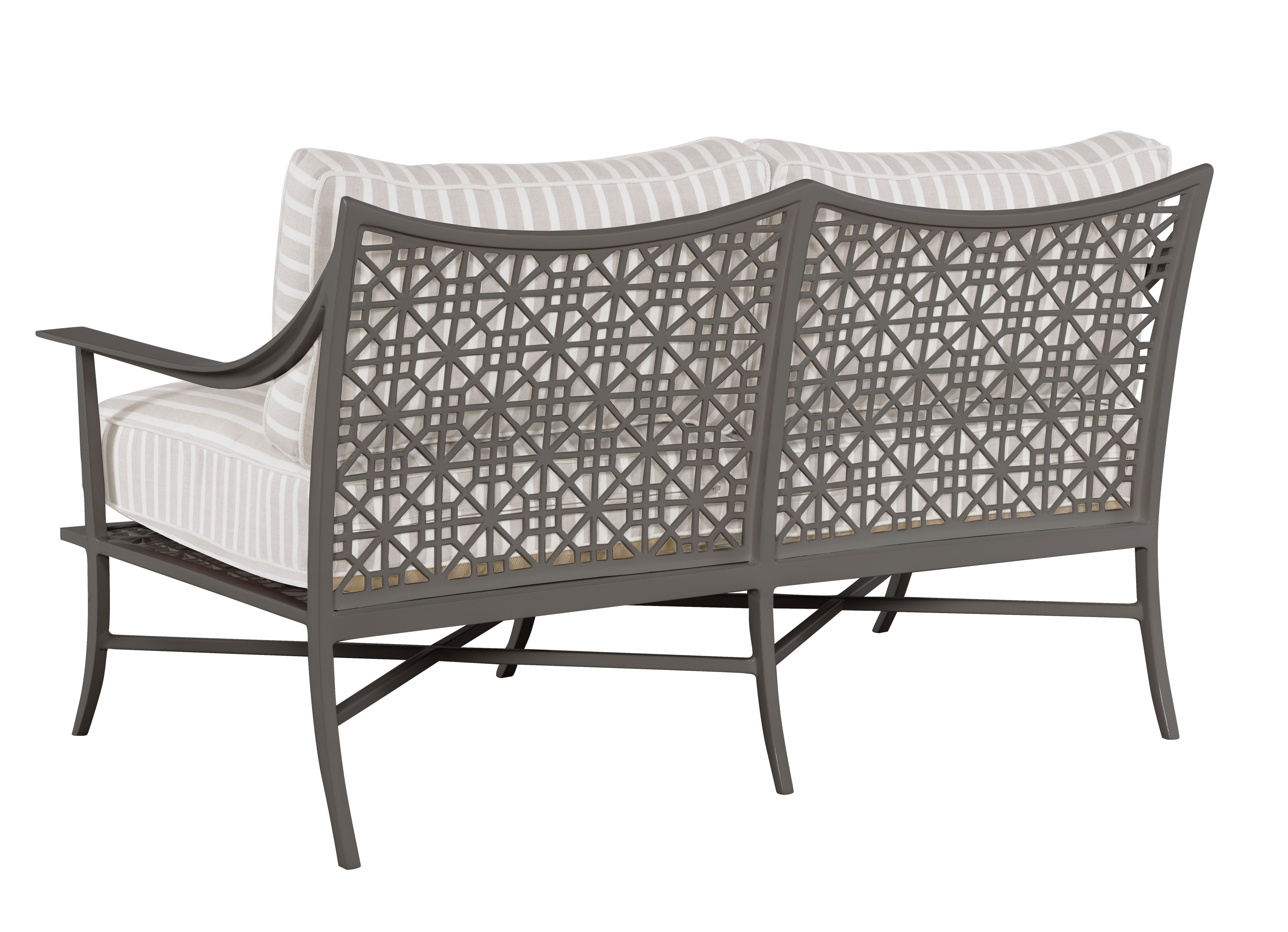The Haret series is an elegant metal outdoor collection with a distinctive signature fretwork on the seat, back and tops of each piece and with lyrical lines of the arms, legs and top rails of the upholstered pieces. The Haret Love Seat is standard with two DryTech seat and back cushions. The Haret series is made from cast aluminum and solids. Smoke Grey finish. Also available in Cloud White finish.