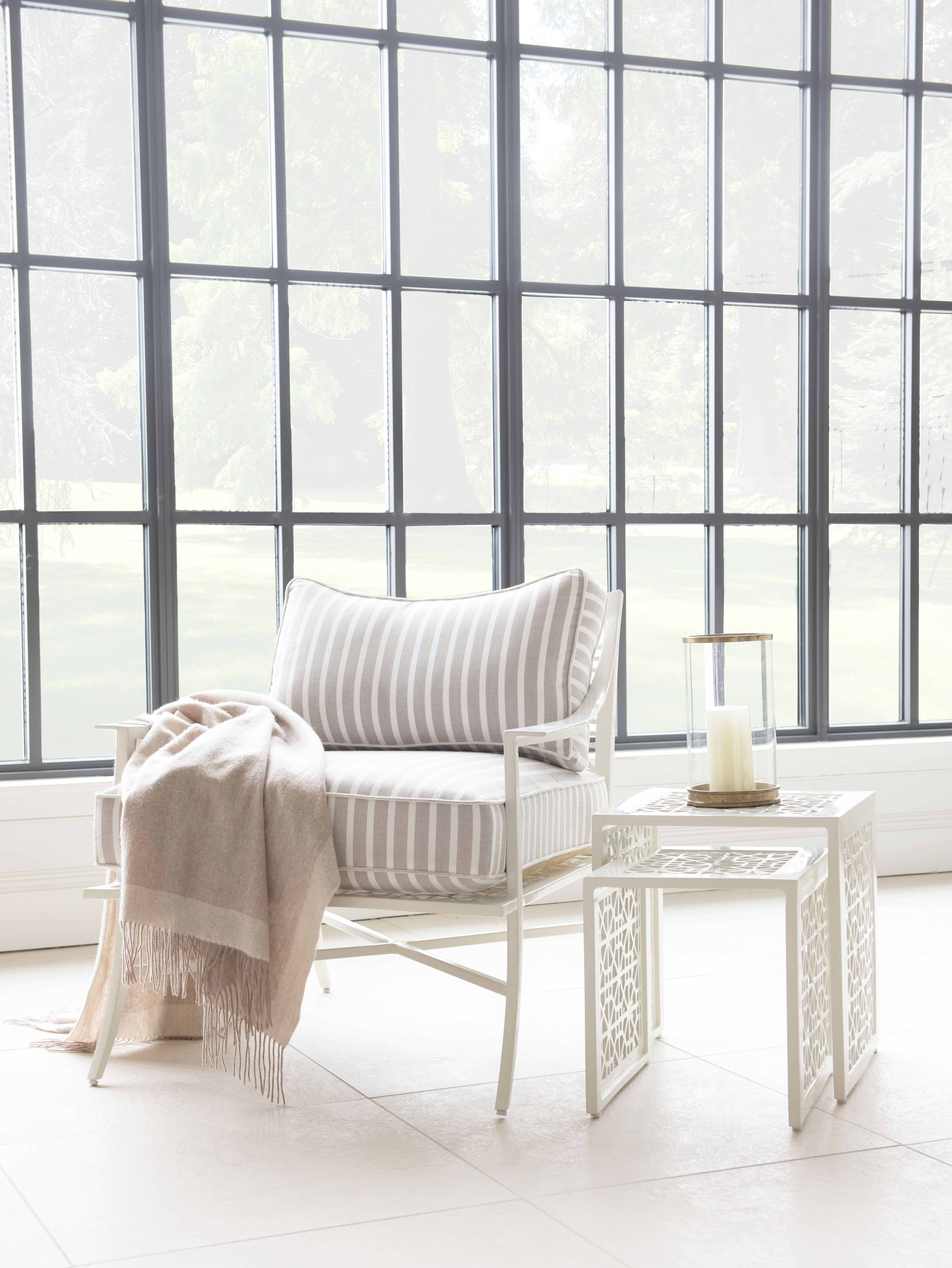 One of the most distinctive items in the Haret outdoor collection are the nesting tables. This nested pair of tables feature the signature fretwork of the series and a Parson’s shape. They are the perfect companion to the Haret Outdoor Chaise Lounge. The Haret series is made from cast aluminum and solids. Shown in Cloud White finish. Also available in Smoke Grey finish. A custom fitted protective cover is sold separately as HCD8985-PC.