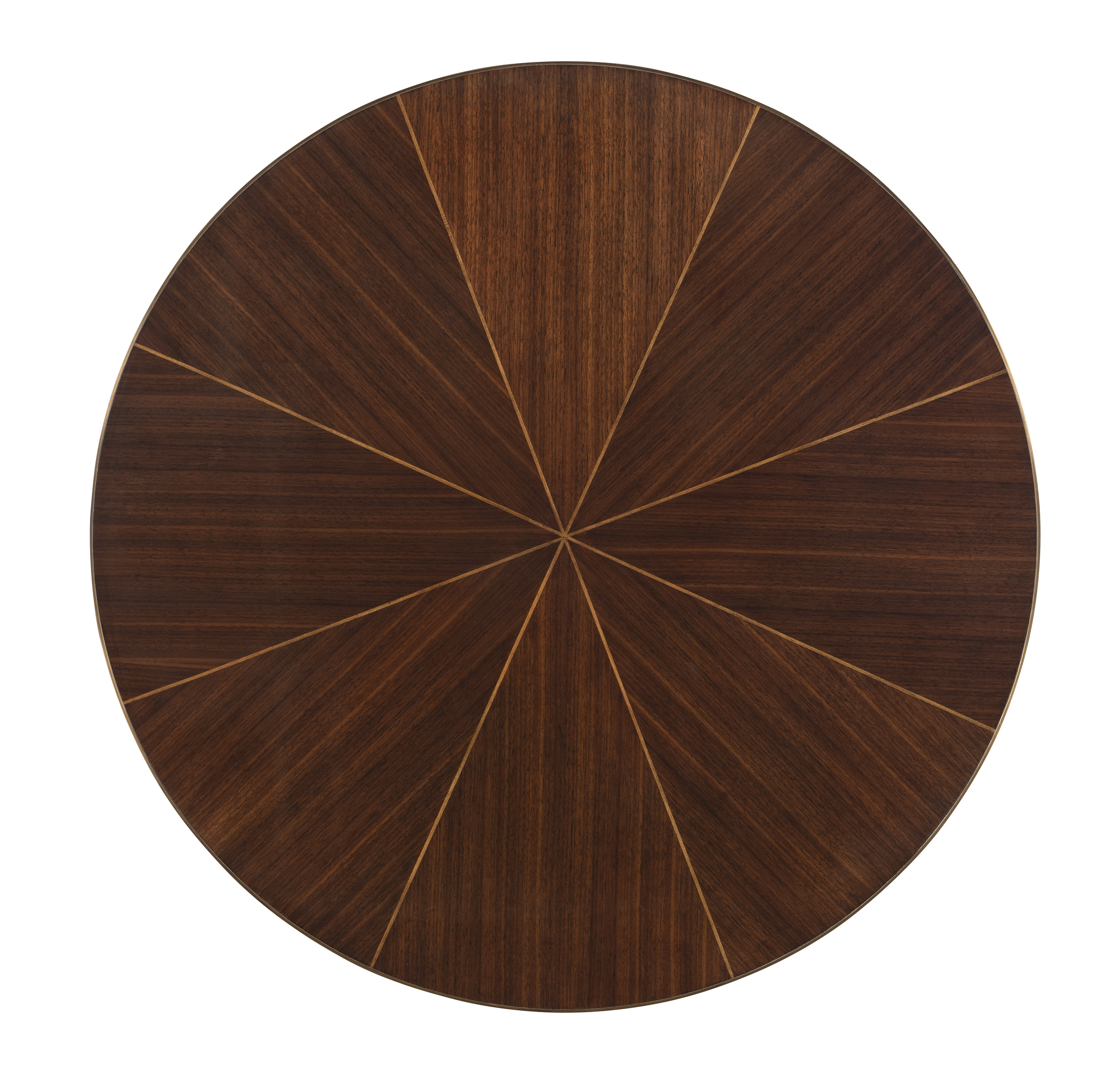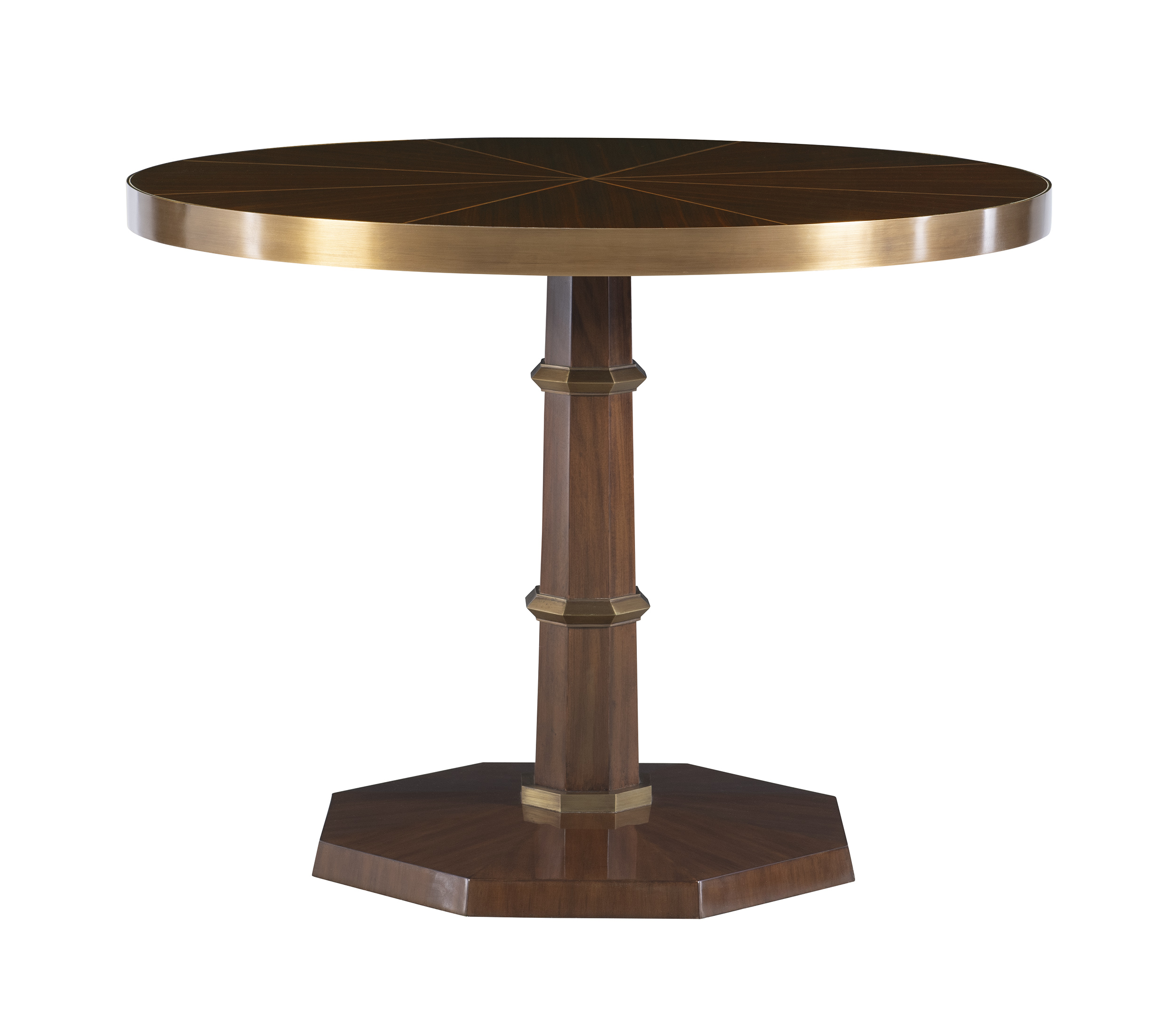 This well-dressed Avino Side Table features a radial-cut walnut top with inlays of Primavera. Assembling the handsome details, David punctuated the top with an aged brass edge banding and added a series of aged brass cuffs to the pedestal hex base. This distinctive table is a great height for a tea table, side table, or center table and can be enjoyed throughout the home. The Avino finish correlates with Hickory Chair's Truffle finish with a high sheen. The Avino table is only available as shown.
