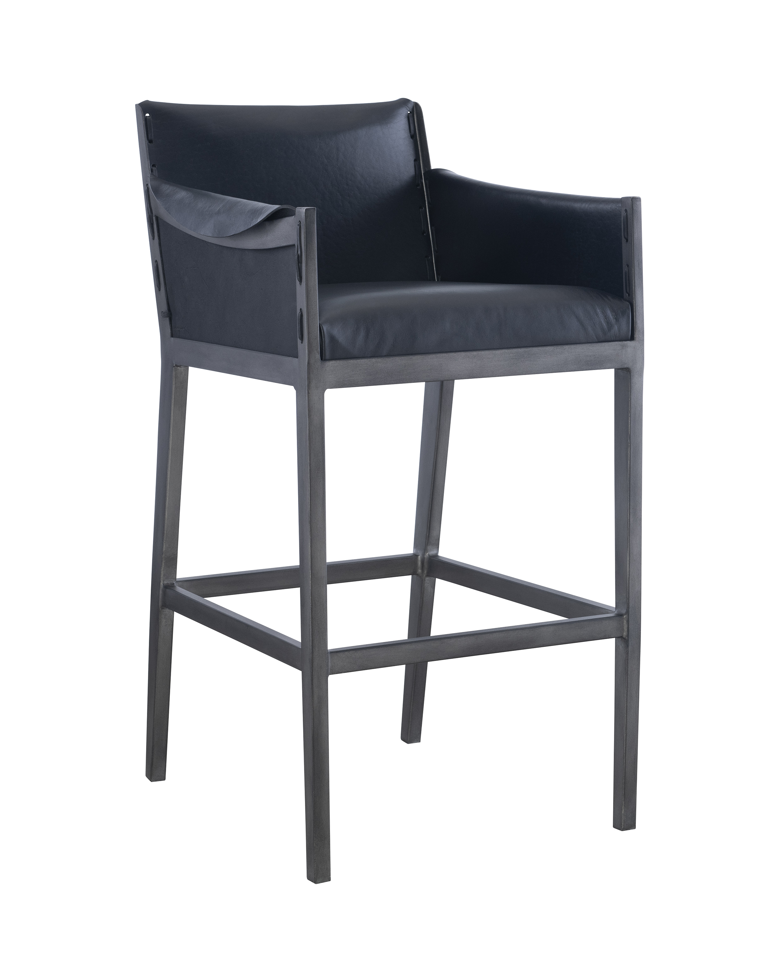 The Gunnison Bar & Counter Stools distressed leather seat, back and arms are fitted to its angular metal frame. Exposed stitching and an unfinished leather exterior add to the design's rustic character, while natural variations and markings on both the leather and the frame make this piece one-of-a-kind.
