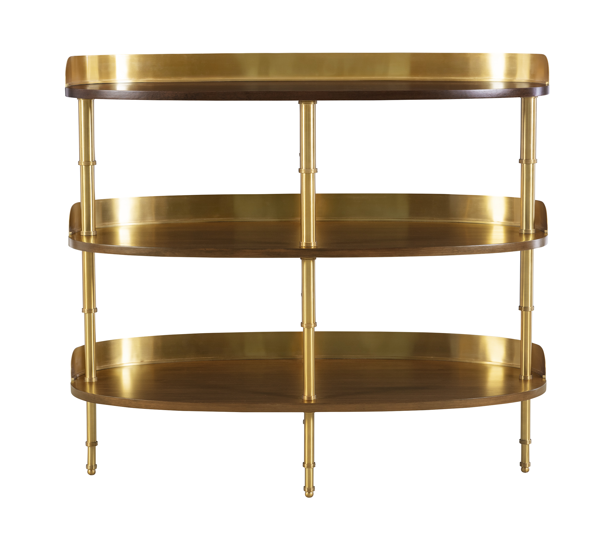 A striking balance of refinement and texture, this bar pays homage to Mariette Himes Gomez’s original design. The frame is elevated with a brass gallery and distinctive brass bamboo uprights, lending a touch of jewelry-like detail and architectural rhythm. Warm walnut shelves, finished in a rich truffle stain, provide both function and depth, offering a luxurious stage for display and storage. Elegant and timeless, this piece embodies Gomez’s legacy of sophisticated restraint and modern classicism.