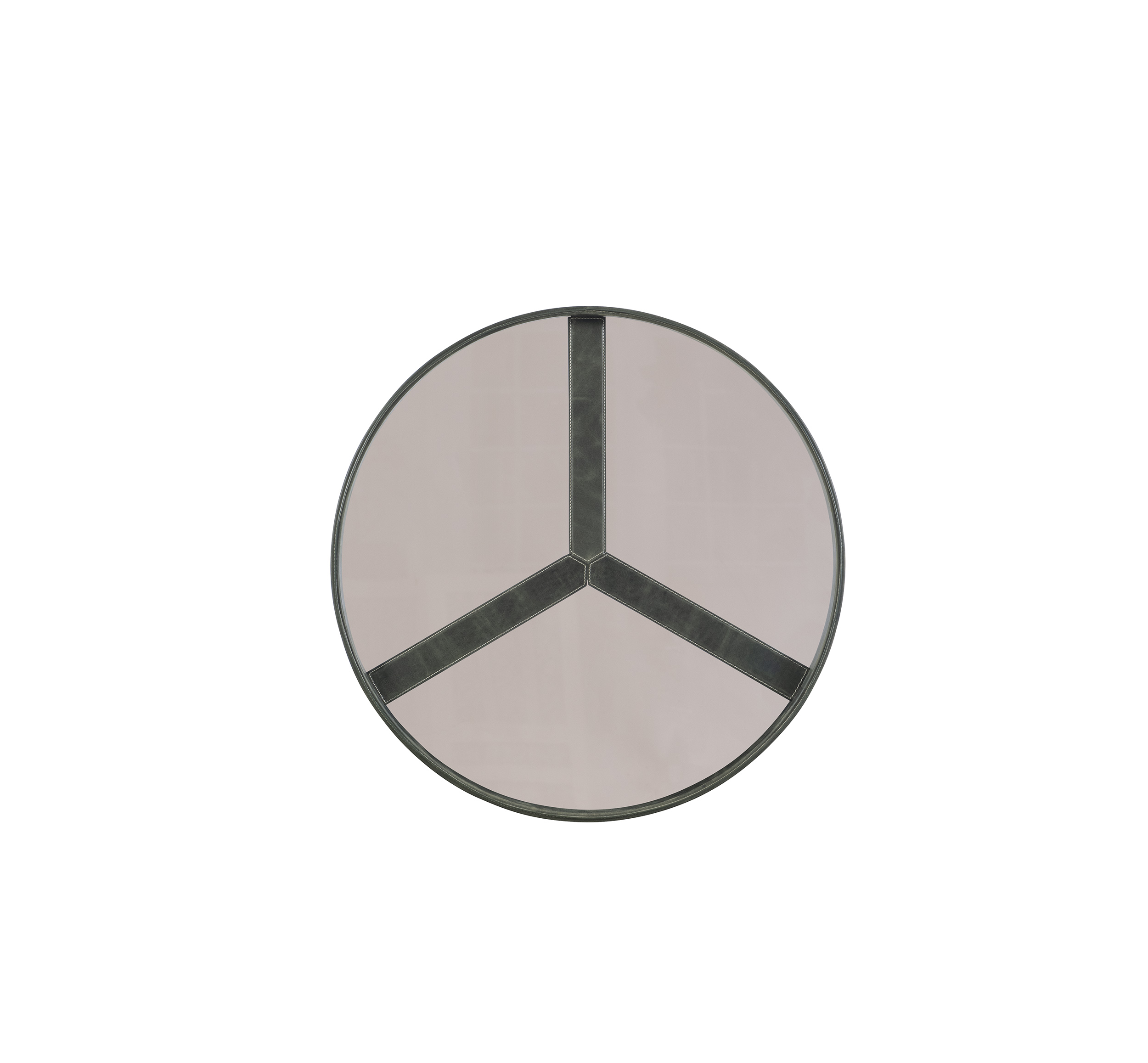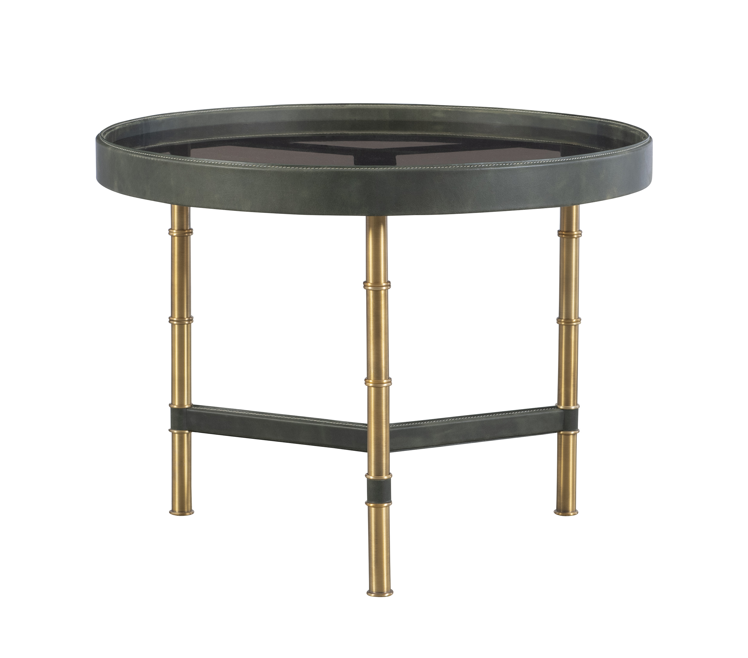 The Valen Cocktail Table blends unique materials to create a striking and versatile design. Functioning as either a low end table or a distinctive cocktail table, it features a top rim and stretchers wrapped in rich forest green leather with distinctive stitching. The brass bamboo-shaped legs add an elegant touch, while the tinted brown glass top introduces a moody sophistication to the overall aesthetic.