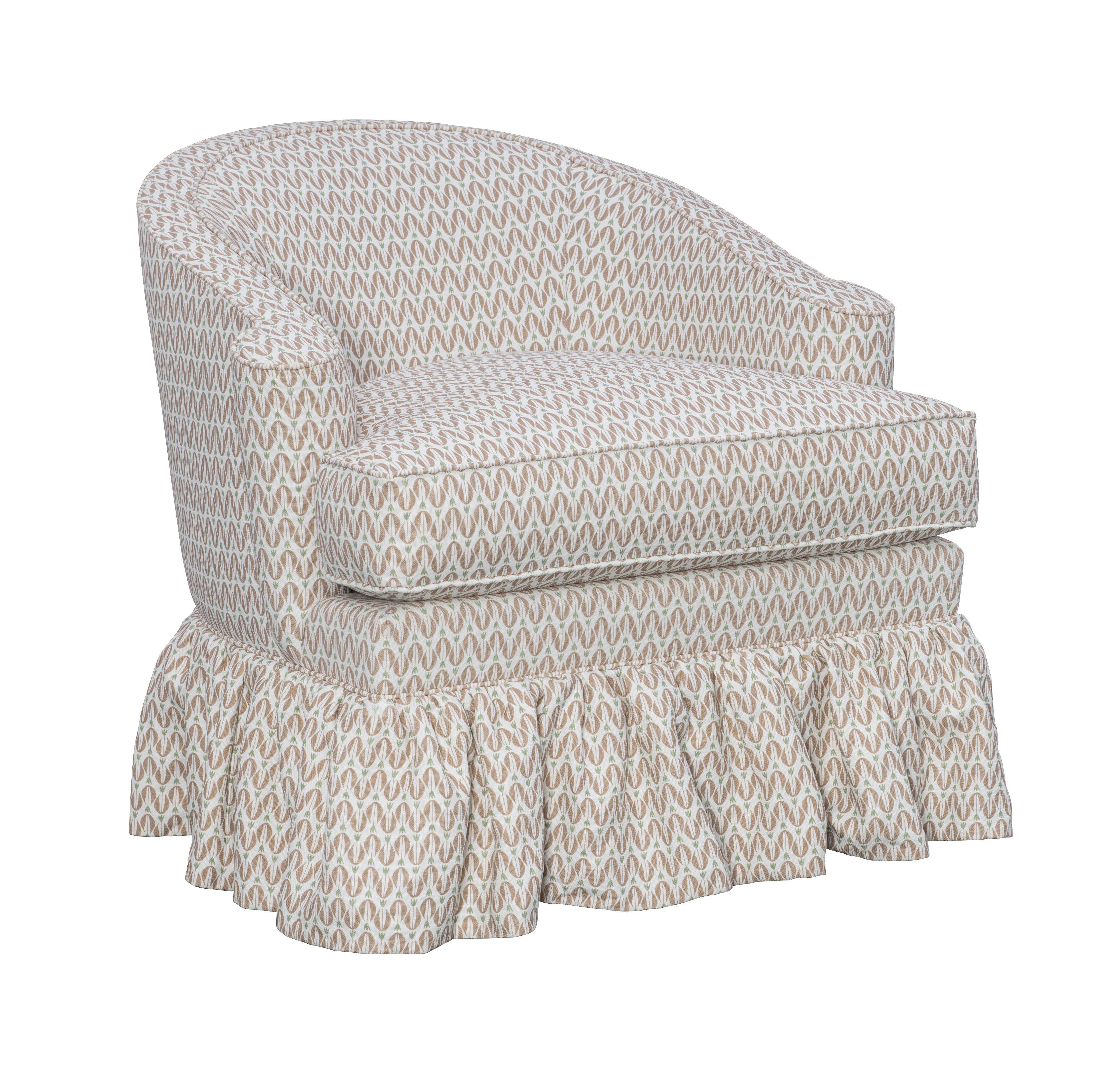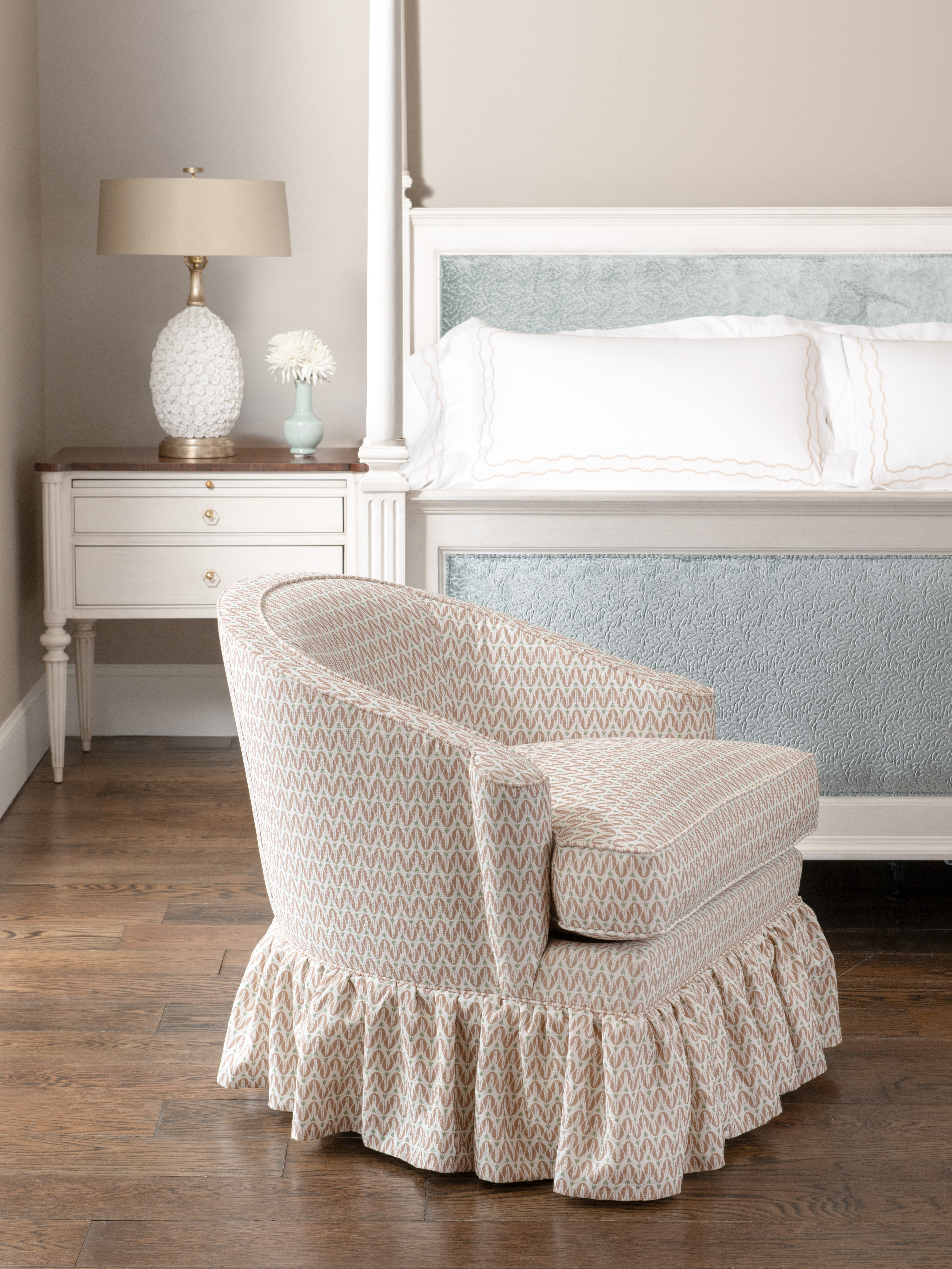 Inspired by Pearson’s iconic frames, we’ve reintroduced the classic Ember in both exposed wood and skirted silhouettes. To expand on the traditional kickpleat skirt, we’ve added new options including a tailored box pleat and a soft shirred ruffle. True to Pearson’s signature sit, the Ember is built with Salem Rod construction (on stationary frames) and comes standard with a Spring Down seat cushion and a tight back. The scroll border arm provides a perfect opportunity for a contrast fabric application. For added versatility, the skirted chair is offered in both stationary and swivel versions.