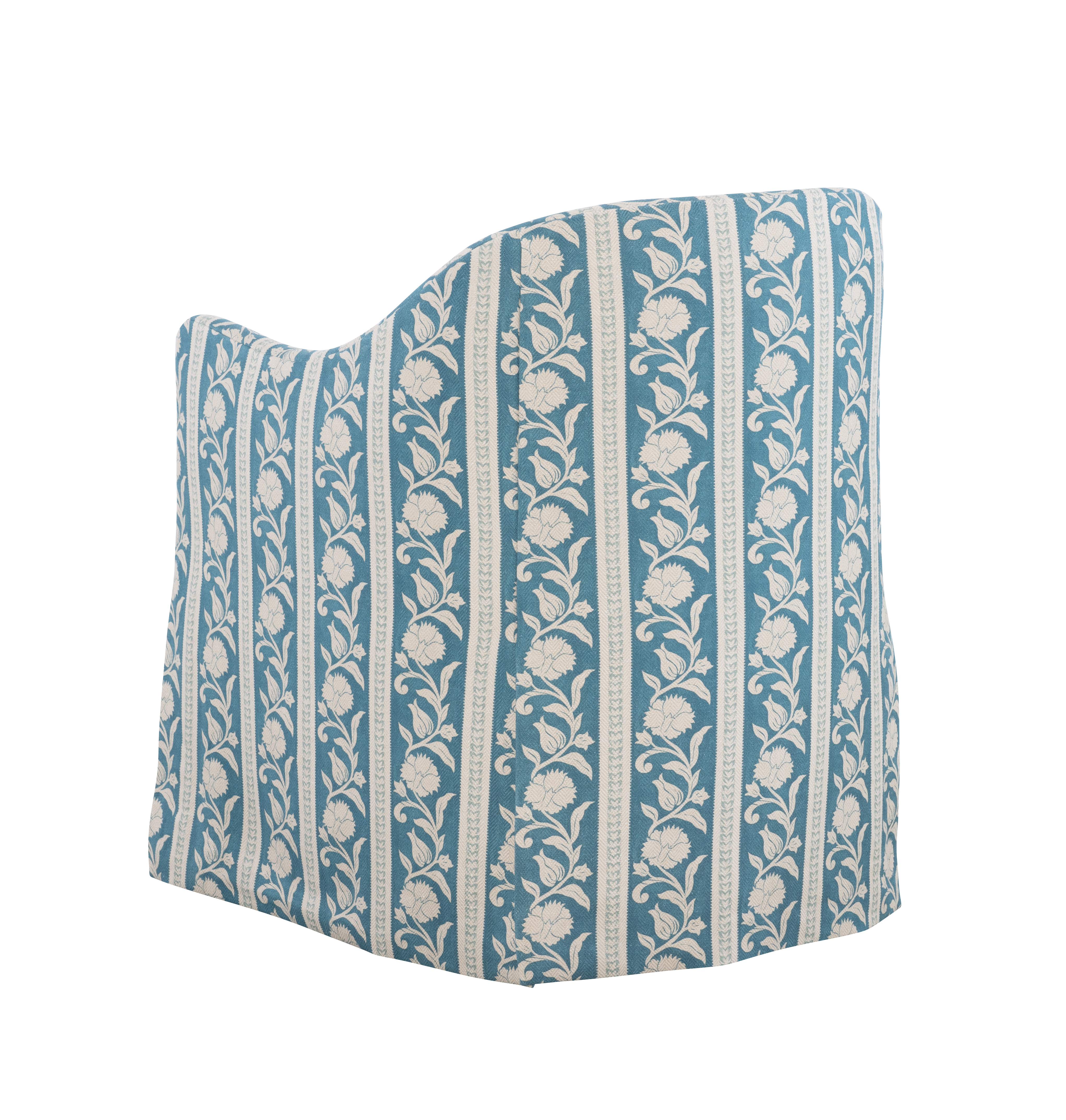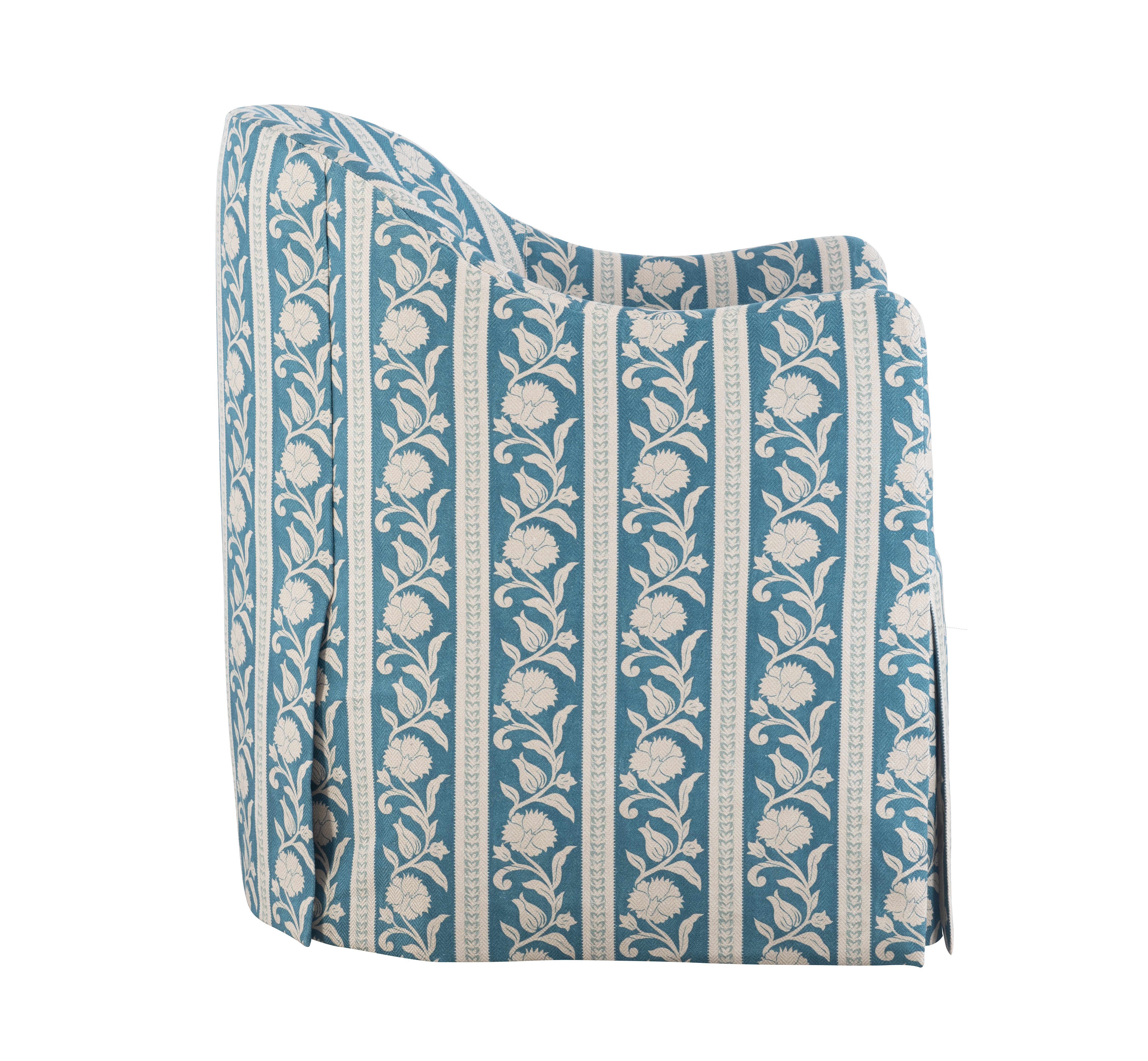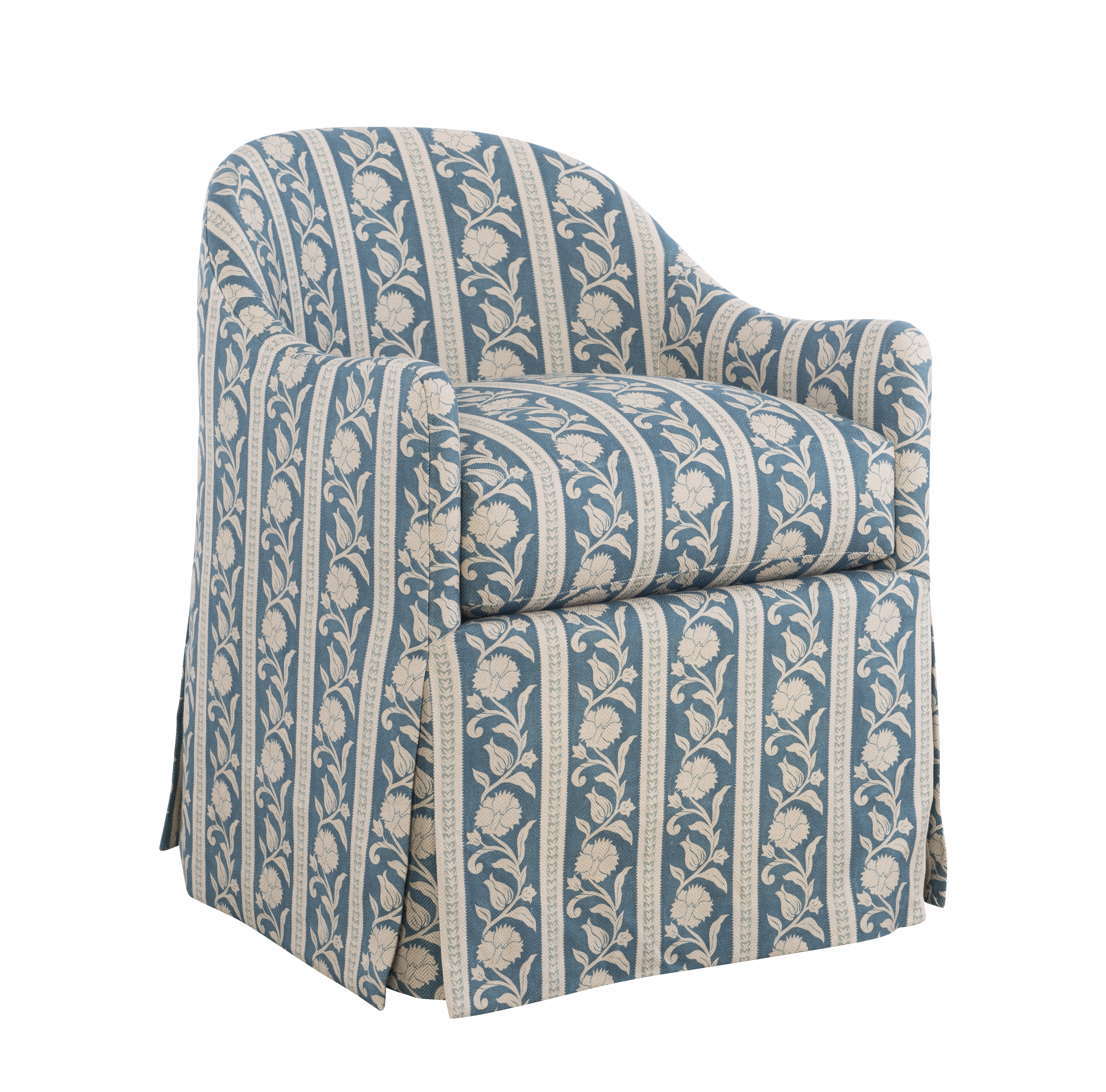 The Jennifer Dining Chair with casters is an elegantly scaled dining chair that is standard with a comfortable spring-down seat cushion and made with a beautiful waterfall skirt. Skip loves softening a dining room with skirted dining chairs to break up a room full of wood furniture. Jennifer is generously scale to be clubby, comfortable and feminine. Spring-Down seat cushion and Tight back standard. Casters standard.