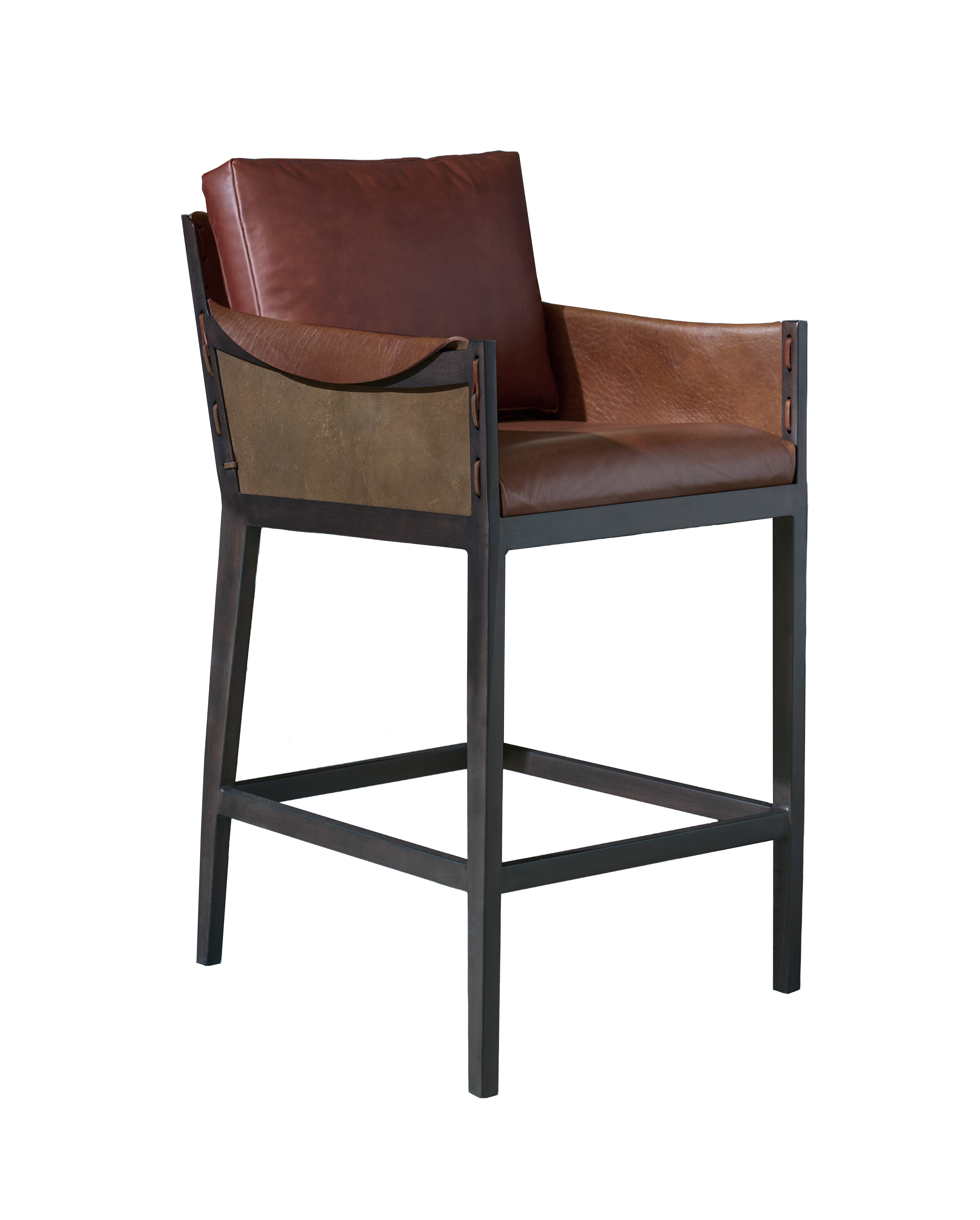 The Gunnison Bar & Counter Stools distressed leather seat, back and arms are fitted to its angular metal frame. Exposed stitching and an unfinished leather exterior add to the design's rustic character, while natural variations and markings on both the leather and the frame make this piece one-of-a-kind.