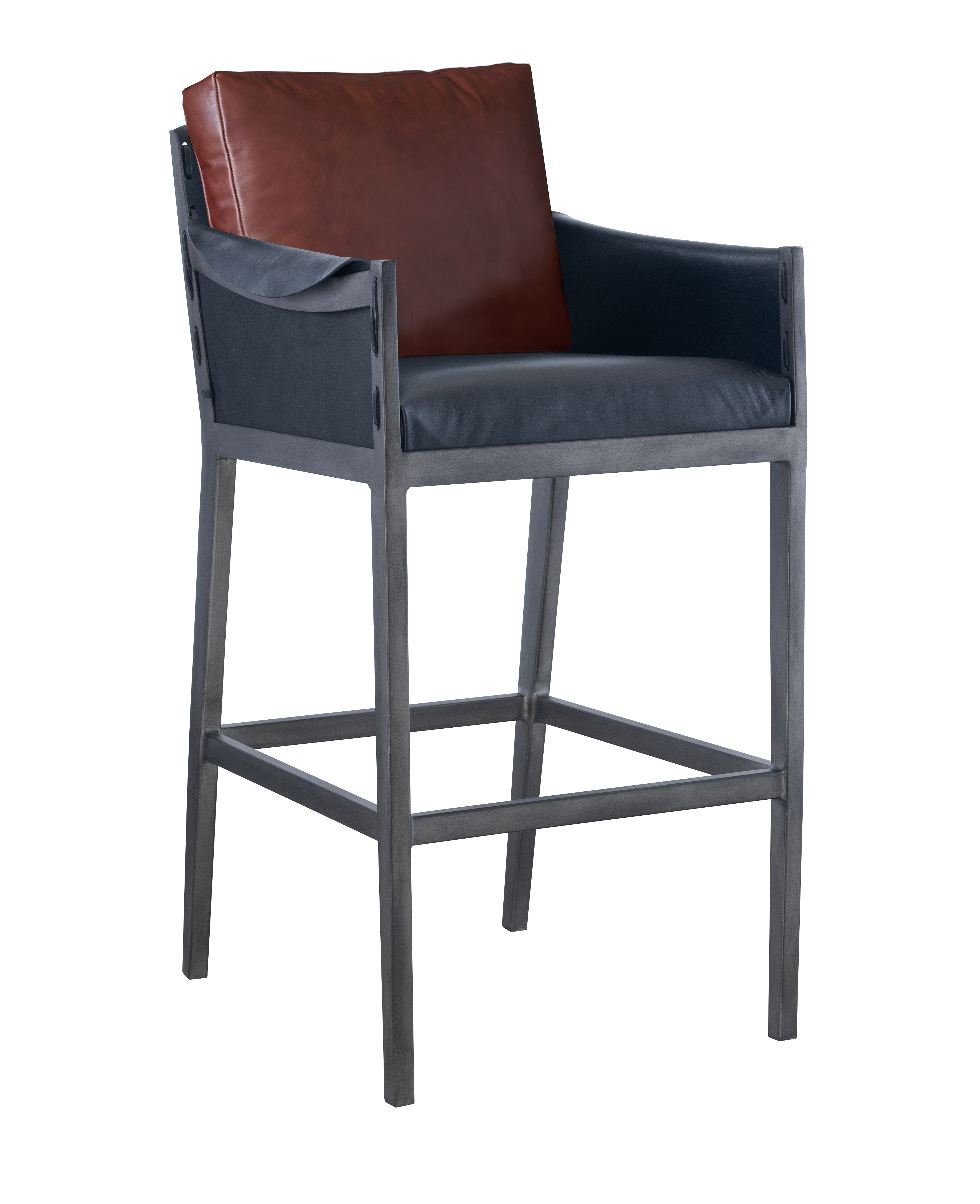 The Gunnison Bar & Counter Stools distressed leather seat, back and arms are fitted to its angular metal frame. Exposed stitching and an unfinished leather exterior add to the design's rustic character, while natural variations and markings on both the leather and the frame make this piece one-of-a-kind.